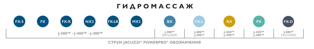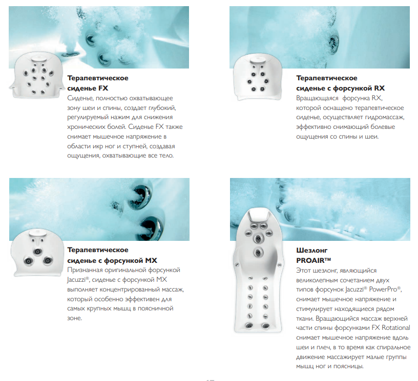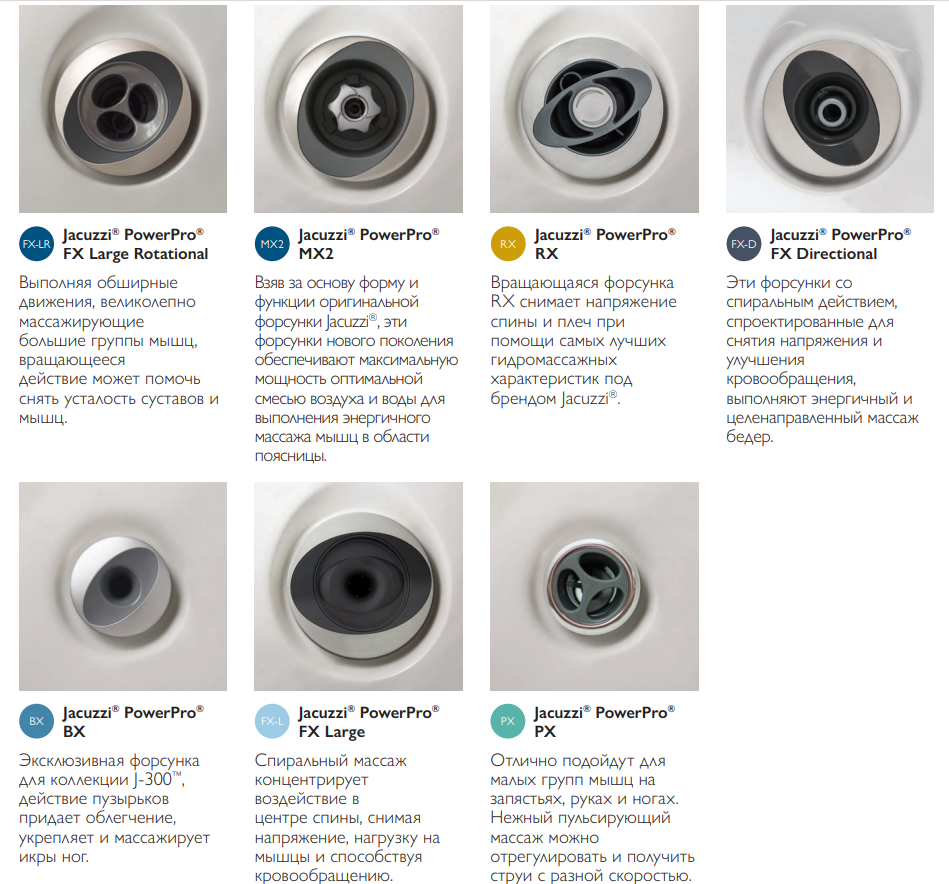 Эксклюзивная система форсунок Jacuzzi® PowerPro® Сочетание Aqualibrium®, форсунок Jacuzzi® PowerPro® и наших эргономично спроектированных сидений гарантирует выполнение регулируемого и действенного гидромассажа, который только можно предложить.