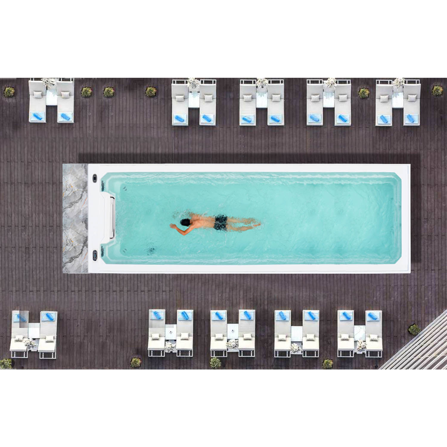 Данная модель бассейна компании Mexda имеет современное техническое оснащение, подходящее для наружной установки.